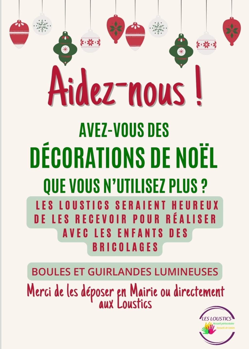 Nous sommes à la recherche de décorations de Noël pour la réalisation de bricolages avec les enfants aux Loustics.