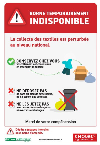Cholet Agglomération informe les habitants que la collecte des bornes de récupération de vêtements usagés est temporairement suspendue, en raison d’une crise nationale affectant fortement la filière de collecte et de tri des textiles.