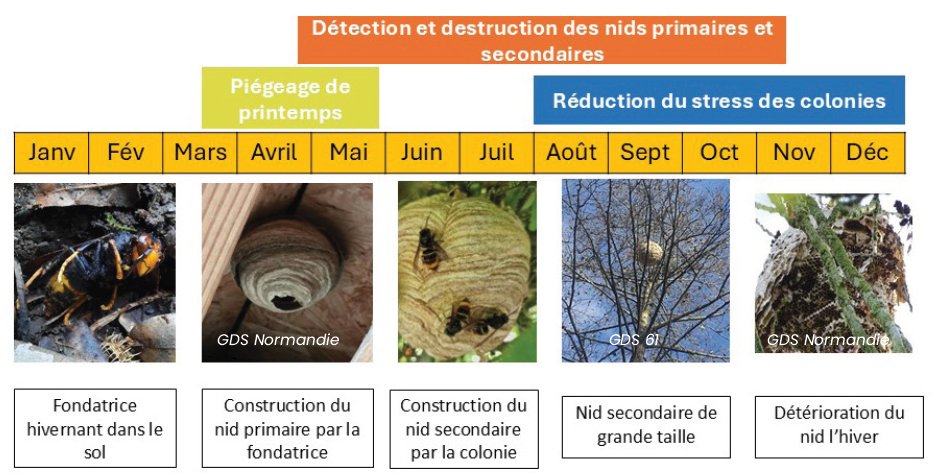 Les pièges recommandés sont équipés d’une grille calibrée qui empêche la capture des insectes non ciblés tout en leur permettant de ressortir, et d’un système qui évite leur noyade. La destruction des nids complète cette action : le repérage et le signalement des nids primaires et secondaires à la mairie facilitent leur élimination. Ces efforts collectifs permettent de protéger les pollinisateurs et d’assurer la sécurité de tous.