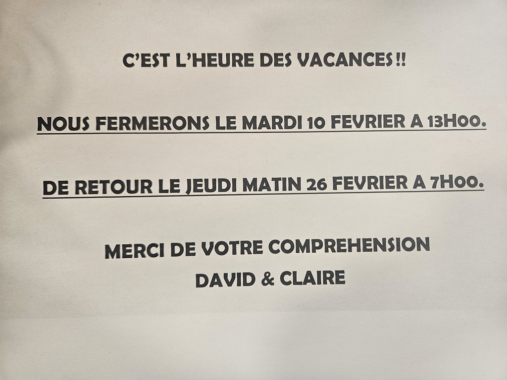 Nous serons fermés du mardi 10 février à 13 h au jeudi matin 26 février 7 h.