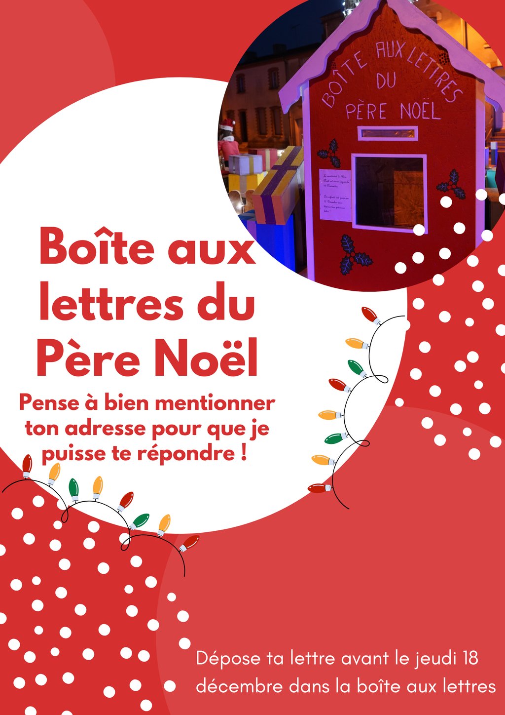 Viens déposer ta lettre au Père Noël dans la boîte aux lettres dès maintenant et jusqu'au jeudi 18 décembre, et surtout n'oublie pas de lui laisser ton nom et ton prénom ainsi que ton adresse pour qu'il puisse te répondre.