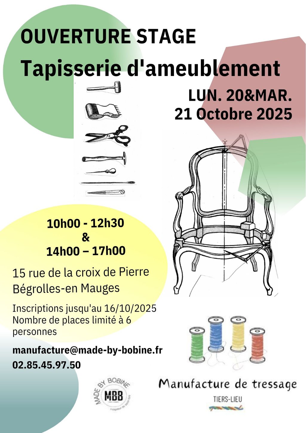 Venez avec votre siège (bridge, voltaire, cabriolet, Louis XV ou XVI…) pour vous initier aux techniques de tapisserie d’ameublement.