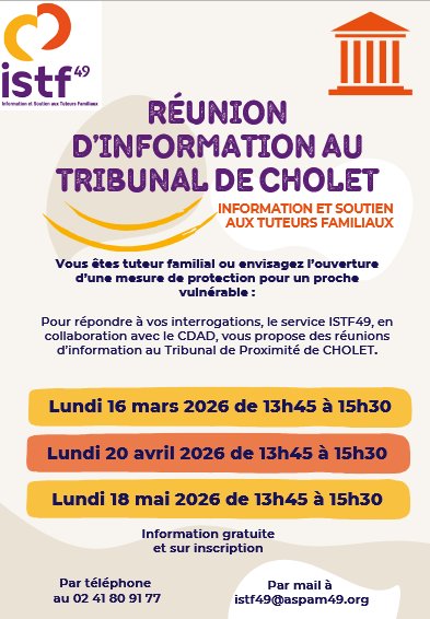 Le service d’Information et de Soutien aux Tuteurs Familiaux du Maine et Loire organise chaque mois une réunion d’information au Tribunal de Proximité de CHOLET, en collaboration avec le CDAD.